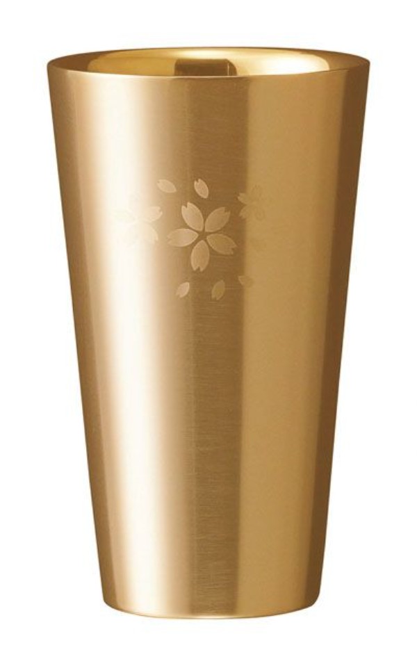 側面サテン仕上のステンレスタンブラーを高級感漂う金メッキを施し、桜の花びらで飾りました。