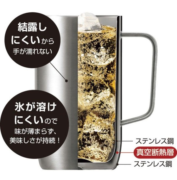 冷たさ長持ちハイボールジョッキ、秘密は真空二重構造。冷たい飲み物も、温かい飲み物も、おいしい温度を長時間キープ。
