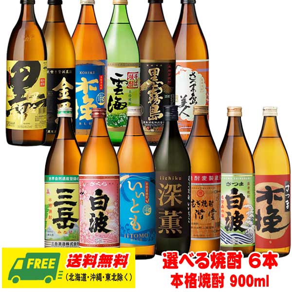 いろんな焼酎を飲み比べ 選べる 麦・芋 焼酎 900ml 6本セット 送料無料 黒霧島 白波 いいちこ 二階堂 三岳