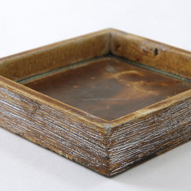 ■滑らかな質感のグレーポット本体と、木目のような加工を施したブラウンの受け皿をセットしたデザイン。