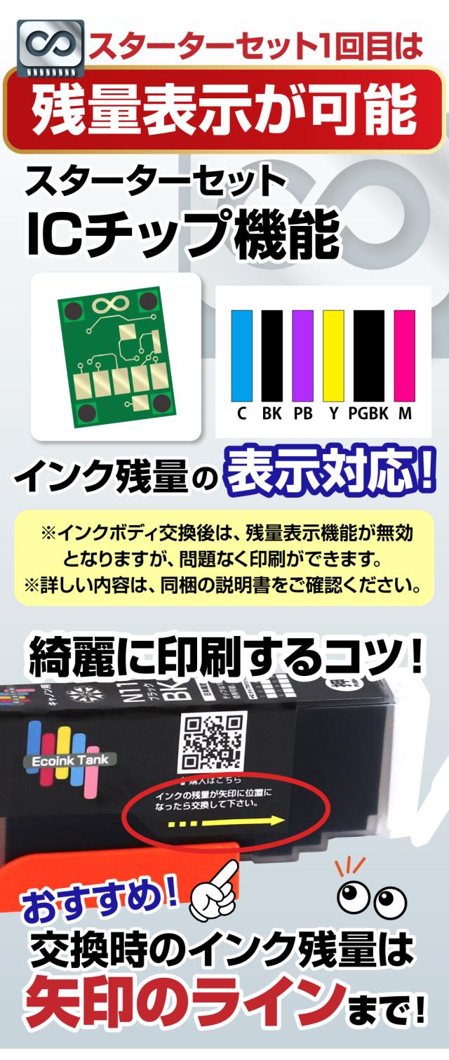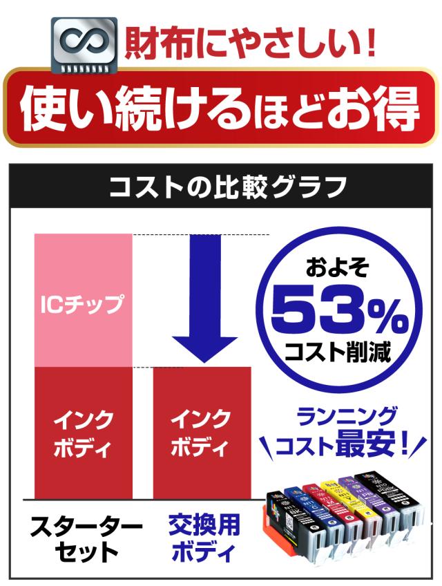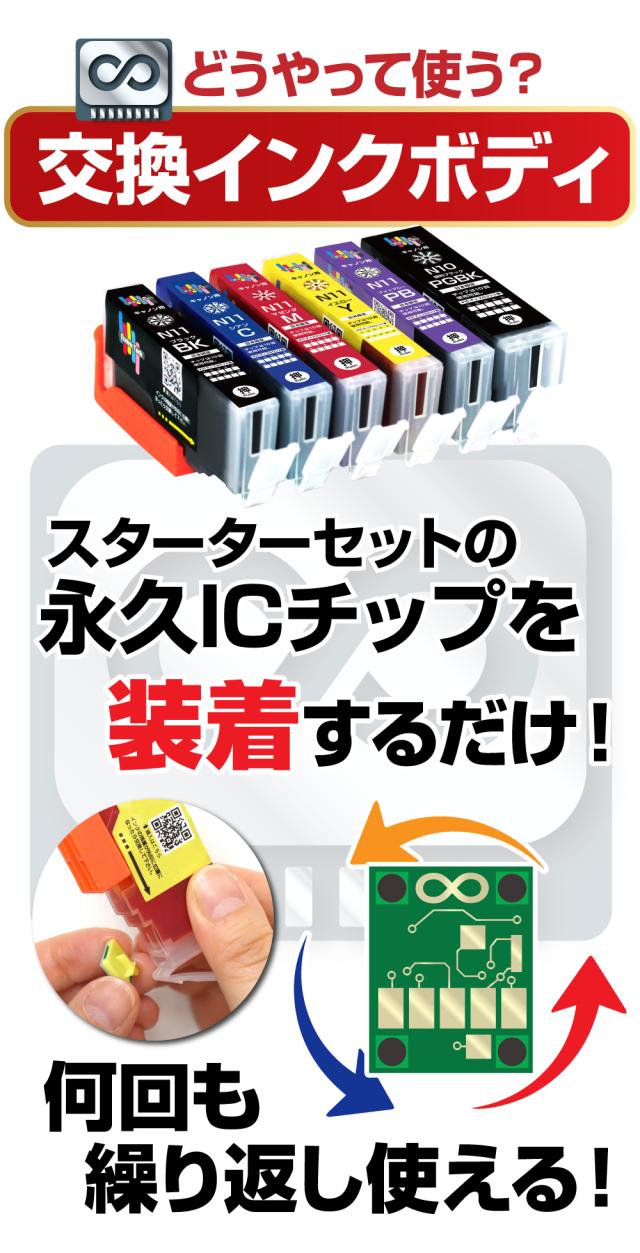 | 繰り返し使える永久ICチップを装着して使用する互換インクカートリッジです。 インクが無くなった際は、インクボディのみ(ICチップなし)を追加でご購入いただき、永久ICチップ付け替えることで、ご使用いただけます。 永久ICチップを繰り返し使用することでコストを削減し、環境にも経済的にも優しい商品です。ぜひお試しください。 |