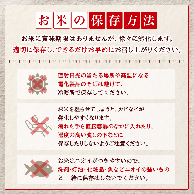 ・お米に賞味期限はありませんが、徐々に劣化(酸化→古米化→食味低下)します。到着後はお早めにお召し上がりください。