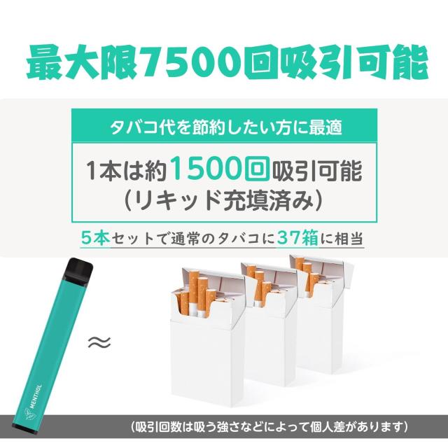 ■使い捨て電子タバコ1本は最 大1500回吸引可能です。5本セットで通常のタバコに37箱に相当!