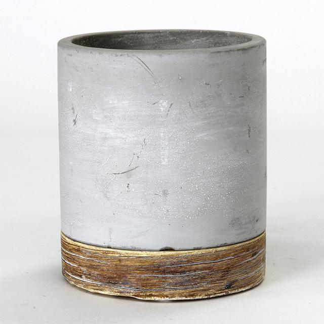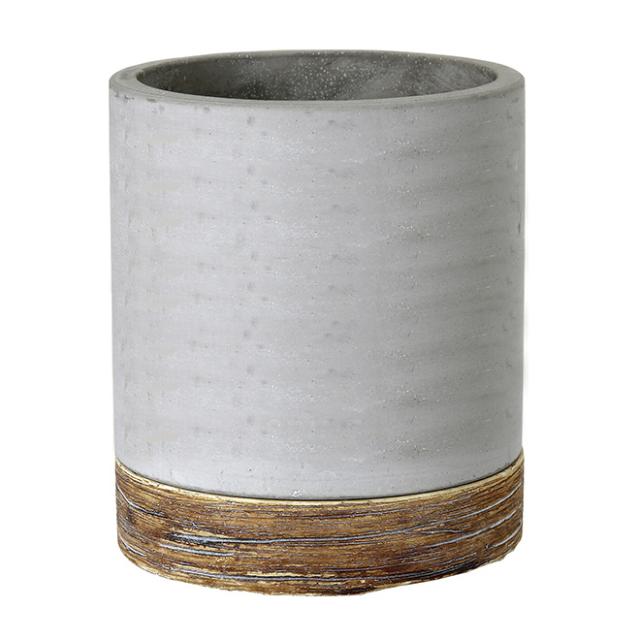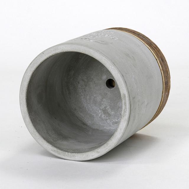 ■滑らかな質感のグレーポット本体と、木目のような加工を施したブラウンの受け皿をセットしたデザイン。