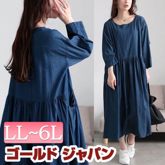 春新作 大きいサイズ レディース ワンピース ギャザーポケットコットンデニムワンピース ワンピ ロングワンピース 長袖 ロング デニム コットン ポケット ギャザー フレア ストレッチ 無地 マタニティ ゆったり 春服 夏服 秋服 LL 2L 3L 4L 5L 6L ネイビー ゴールドジャパン