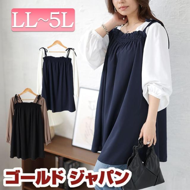 春新作 大きいサイズ レディース チュニック ドッキングキャミソールチュニック 長袖チュニック ロング 長袖 ドッキング キャミ ボリュームスリーブ ボリューム袖 フレア シャーリング フリル ゆったり 春服 秋服 LL 2L 3L 4L 5L ネイビー ブラック 黒 ゴールドジャパン