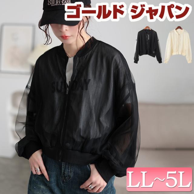 春新作 大きいサイズ レディース アウター ジャケット コート ブルゾン チュールクロップドMA-1ブルゾン MA-1 春アウター チュール ジップ クロップド シアー ドロップショルダー 無地 ゆったり 春服 夏 秋服 LL 2L 3L 4L 5L オフホワイト 白 ブラック 黒 ゴールドジャパン