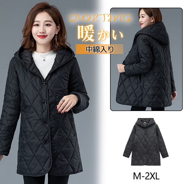 ポイント増量中 キルティング 中綿ジャケット レディース ダウン風コート フード付き アウター 秋冬 ロング丈 シンプル カジュアル 軽量 通勤 無地 暖かい agesugi_sfa