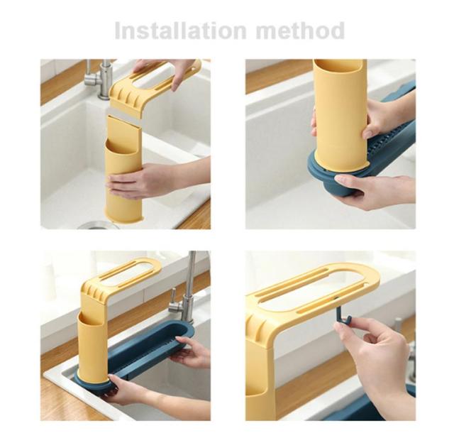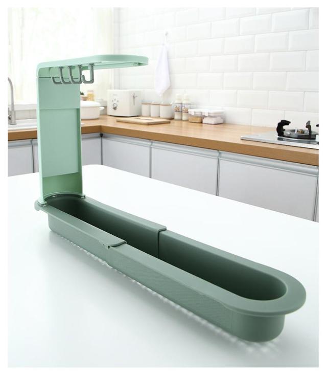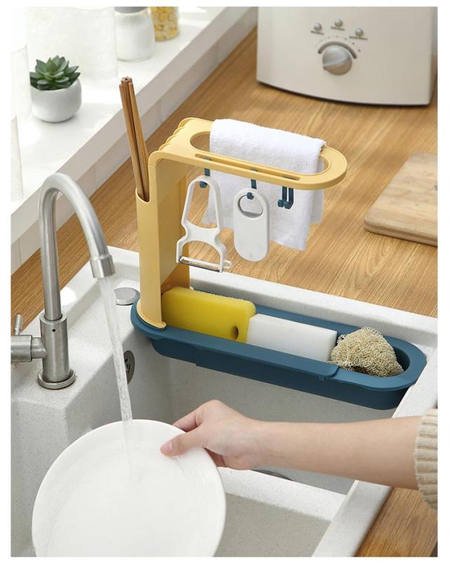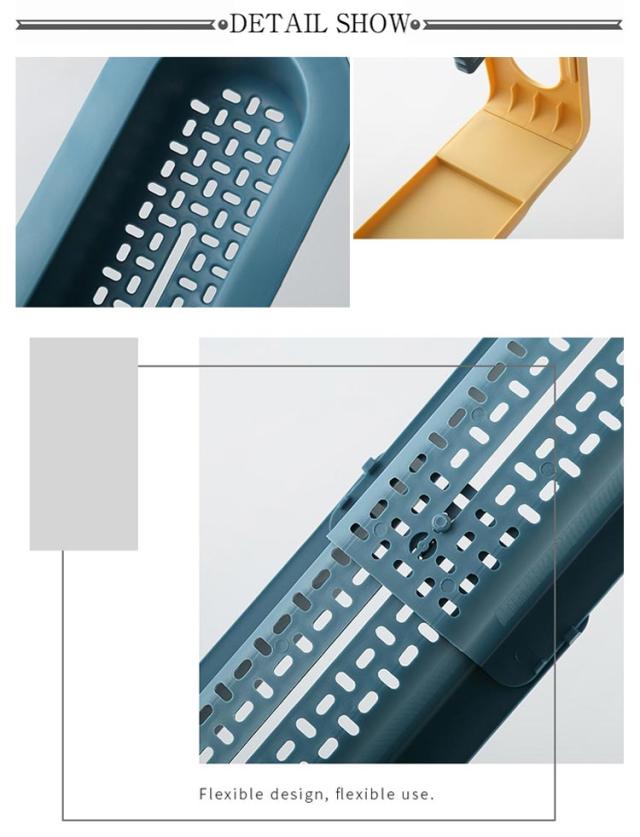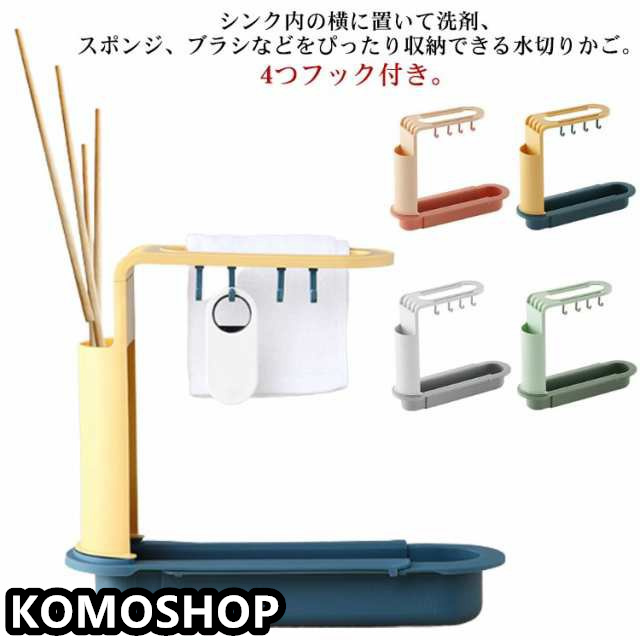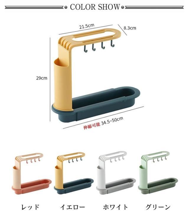 | シンク内の横に置いて洗剤、スポンジ、ブラシなどをぴったり収納できる水切りかご。4つフック付き。 ラックの長さ(34-50cm)を自由に変更できます。 スリム設計なので狭いシンクの中に掛けても邪魔にならない。 フックや布巾掛け付きで、湿気によるカビや水垢や汚れを生じることを防止。布巾や掃除用品などを清潔に保つことができます。 洗ってポンッと置くだけでシンクへ自然に水を流す水切りかご。 シンプルなデザインなので様々なキッチンにマッチします。 | |
