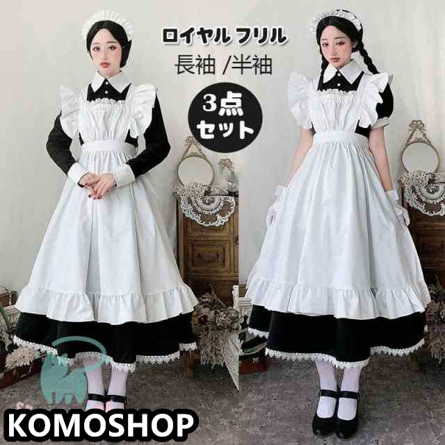メイド服 ロング コスプレ衣装 長袖 エプロン クラシカル ロイヤルメイド レディース 大人用 イギリス風 魔女 クラシカルロング ワンピースロイヤル フリル