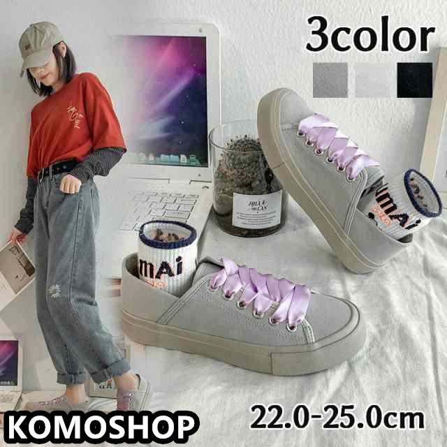 スニーカー バブーシュ レディース 婦人用 女性 運動靴 ローカット フラットソール レースアップ サテン調リボン おしゃれ か