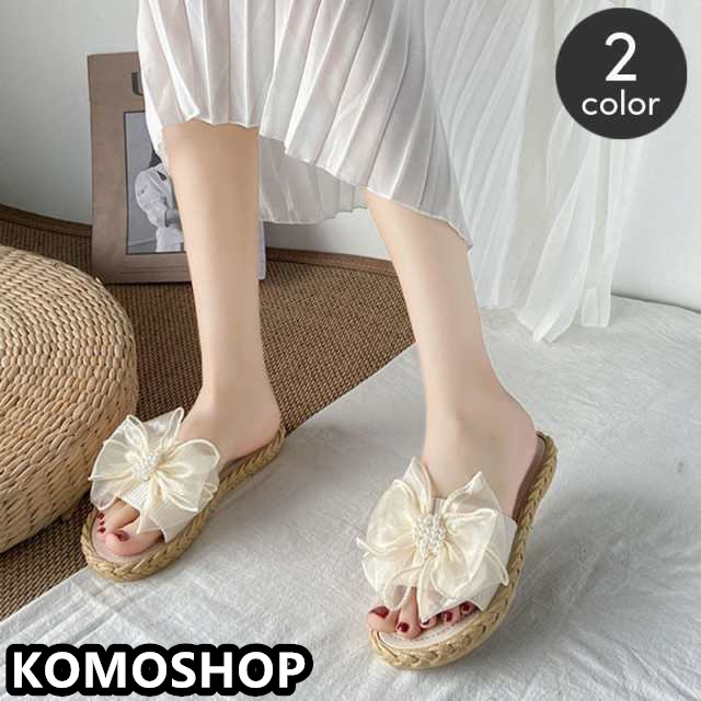 サンダル フラット オープントゥ レディース シューズ 靴 前開き つっかけ ぺたんこ リボン シフォン フェイクパール おしゃ