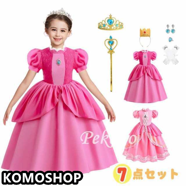 子供 ピーチ姫 プリンセス ドレス お姫様 コスプレ 女の子 なりきり 7点セット ティアラ 冠 誕生日 発表会 コスチューム 110 120 130 140 150