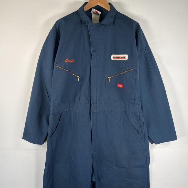 古着 ディッキーズ Dickies 長袖つなぎ オールインワン ワーク 作業着 大きいサイズ サイドポケット ワッペン ダブルファスナー ネイビー