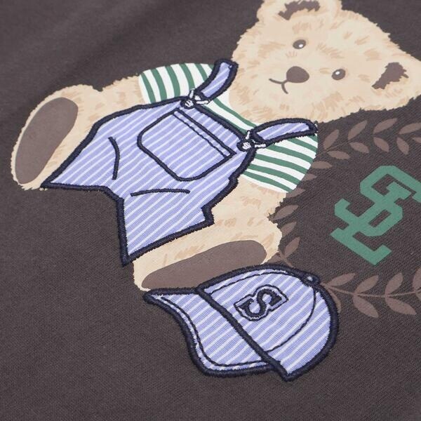 プリントしたクマさんのオーバーオールとキャップはパッチ刺しゅうになっていて立体的なのが楽しい◎