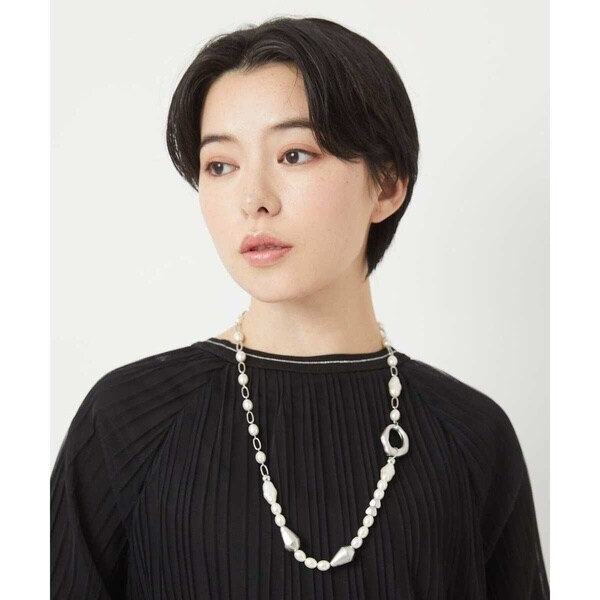 メタルメッキを施した軽いパーツとイミテーションパールのコンビネックレス。華やかなオケージョンシーンやお仕事スタイルにも合わせていただけるきちんと感溢れるネックレスです。エレガントさのあるパールやモチーフがミックスされておりアシンメトリーな配置が付け方によっては、様々なスタイルを楽しめます。個性的ながら首元から上品に魅せてくれるのでどんなシーンでも使いやすいアイテムです。