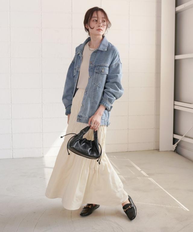 スカートにボリュームがあるのでコンパクトなサイジングのトップスと合わせるとバランスがマッチします。あえてゆるっとしたスタイリングも抜け感あって◎。