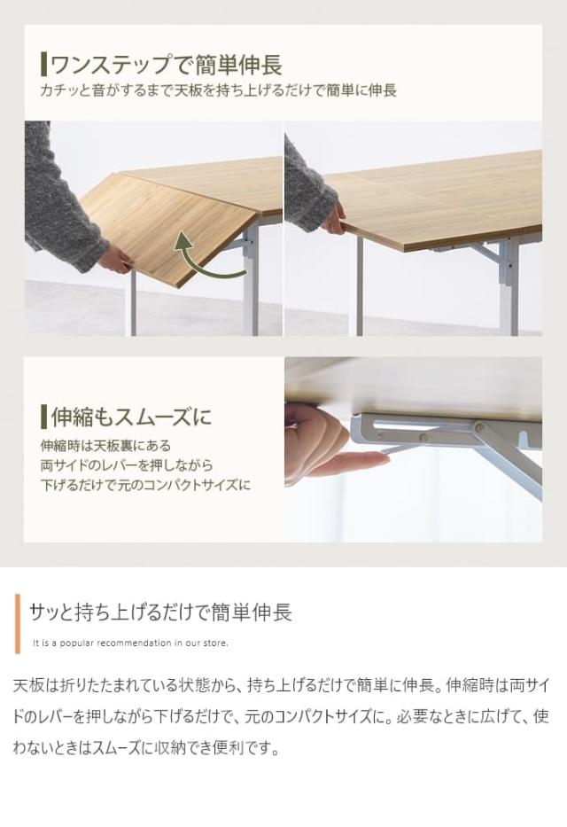 天板のサイズを調整できる伸縮式テーブルは、普段はコンパクトに、来客時には広々と使えて便利。