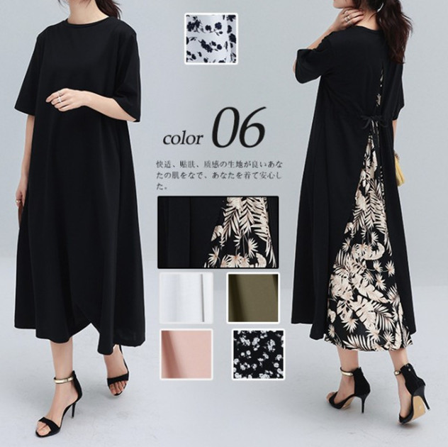 レディース 花柄 ワンピース ロング丈ワンピース 半袖ワンピース ロンT ロングワンピ レイヤード風 異素材 ラウンドネック ホワイト ブラック ピンク フレアワンピース 20代 30代 40代 50代 60代 カーキ グリーン