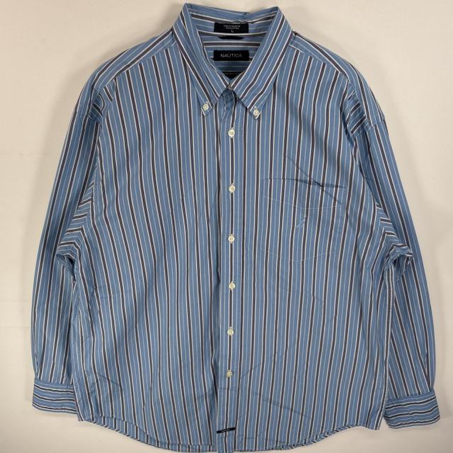 古着 ノーティカ NAUTICA 長袖シャツ ボタンダウンシャツ ワンポイント ロゴ 刺繍 胸ポケ L ブルー系 ストライプ メンズ