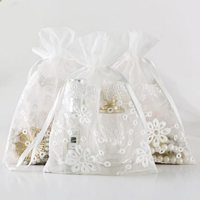 ラッピング 袋 ギフトバッグ レース刺繍 巾着袋 小物入れ かわいいレース刺繍 ポーチ袋 プレゼント用 ジュエリー収納 (L(16*23CM))