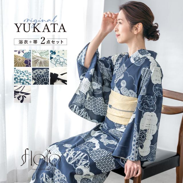 浴衣 セット レディース 浴衣セット 半幅帯 2025 floro 簡単 涼しい コーディネート済み 白 緑 紺 黒 灰色 ベージュ クリーム 30代 40代 50代 S フリー 送料無料