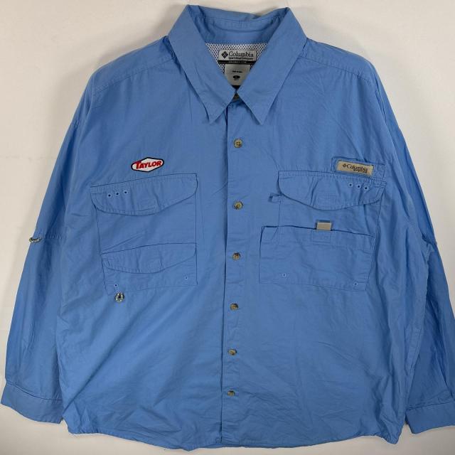 古着 コロンビア Columbia 長袖シャツ ボタンダウンシャツ PFG ワンポイント ロゴ L ブルー系 無地 メンズ