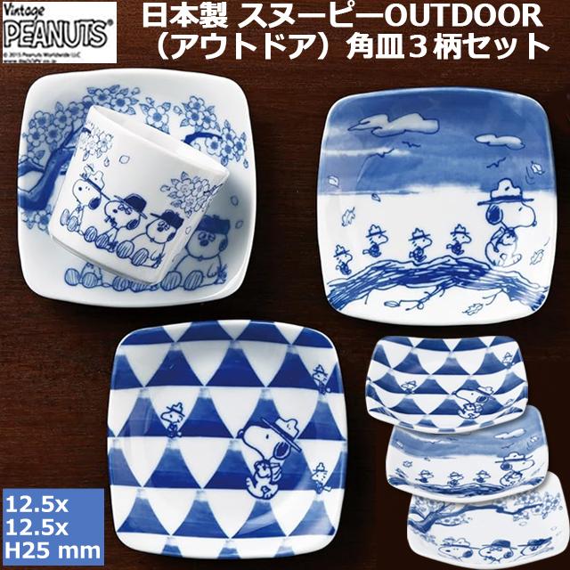 日本製 スヌーピーOUTDOOR アウトドア 角皿3柄セット PEANUTS SNOOPY 小皿3枚セット 125×125×H25mm 和食器 磁器 食器
