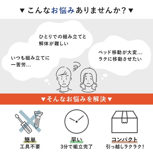| 【商品紹介】 ネジなし、工具不要で簡単組立。お部屋に馴染むシンプルなデザインの宮棚とコンセント付きベッド |