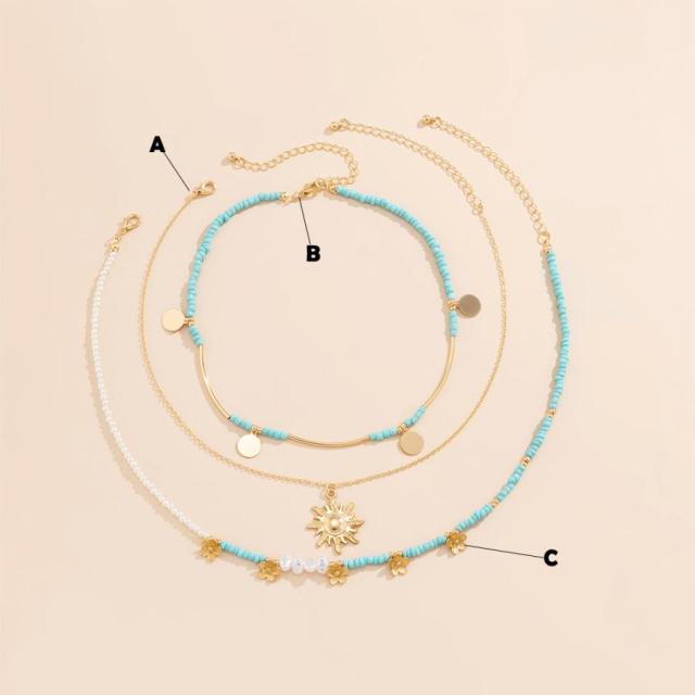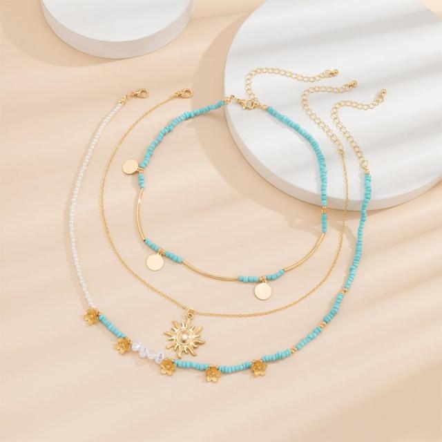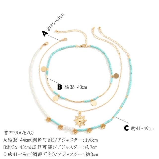 それぞれデザインが異なる細めチェーンで仕上げたリゾート風3点セットネックレスです