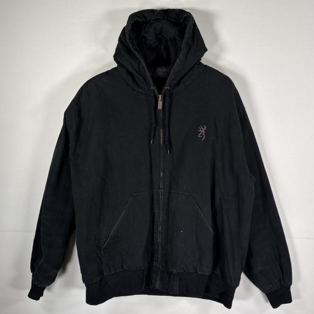 古着 ブローニング BROW NING ダック ワークジャケット フルジップ ワンポイント刺繍 フード付き XL ブラック メンズ