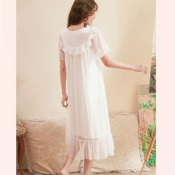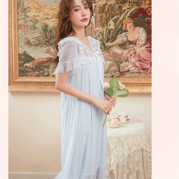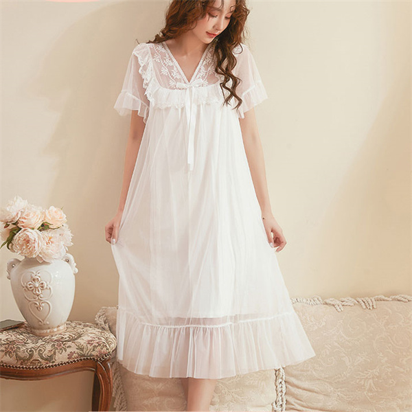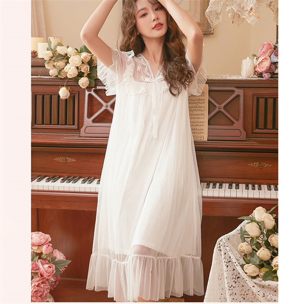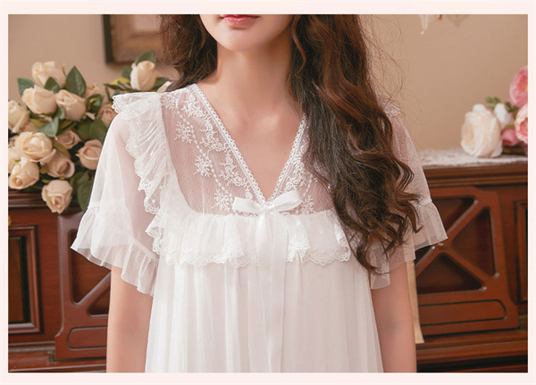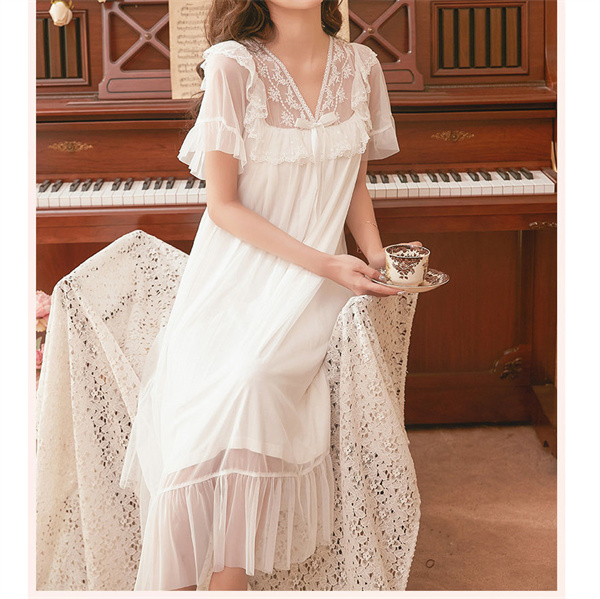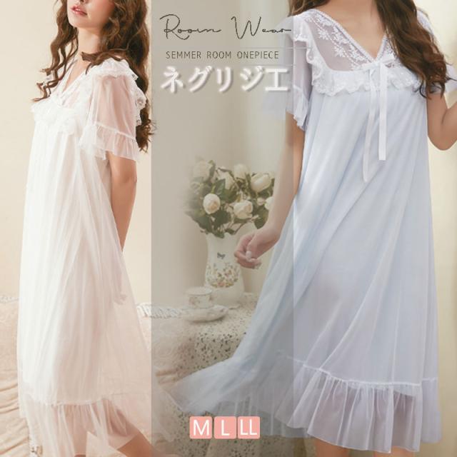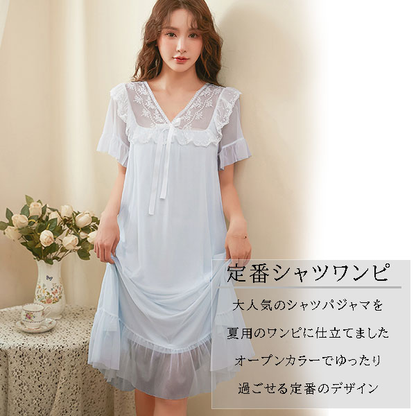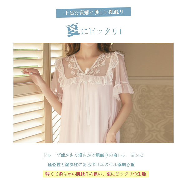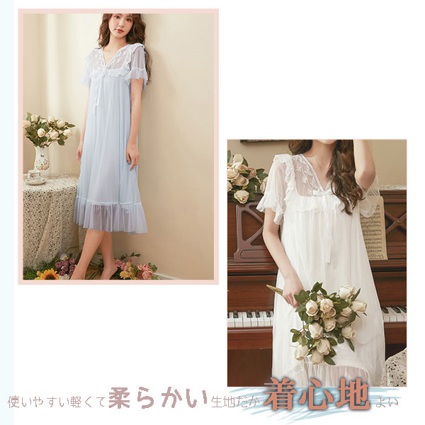 ネグリジェ レディース 半袖 レース Vネック ワンピース パジャマ バスローブ ロング丈 涼しい 部屋着 春夏 柔らかい 寝間着 シンプル 旅行用