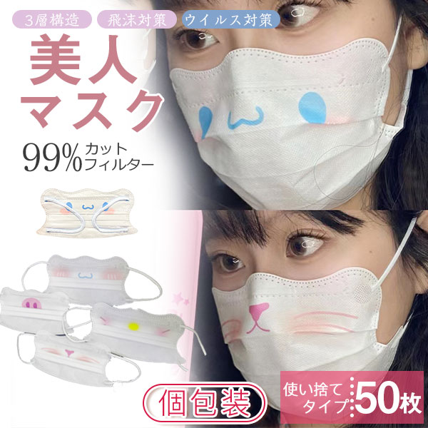 マスク 小顔 50枚 不織布 やわらか 小さめ 3D 4D ファッション バイカラー プレミアム 3層 フィット 美人マスク 蒸れない 快適