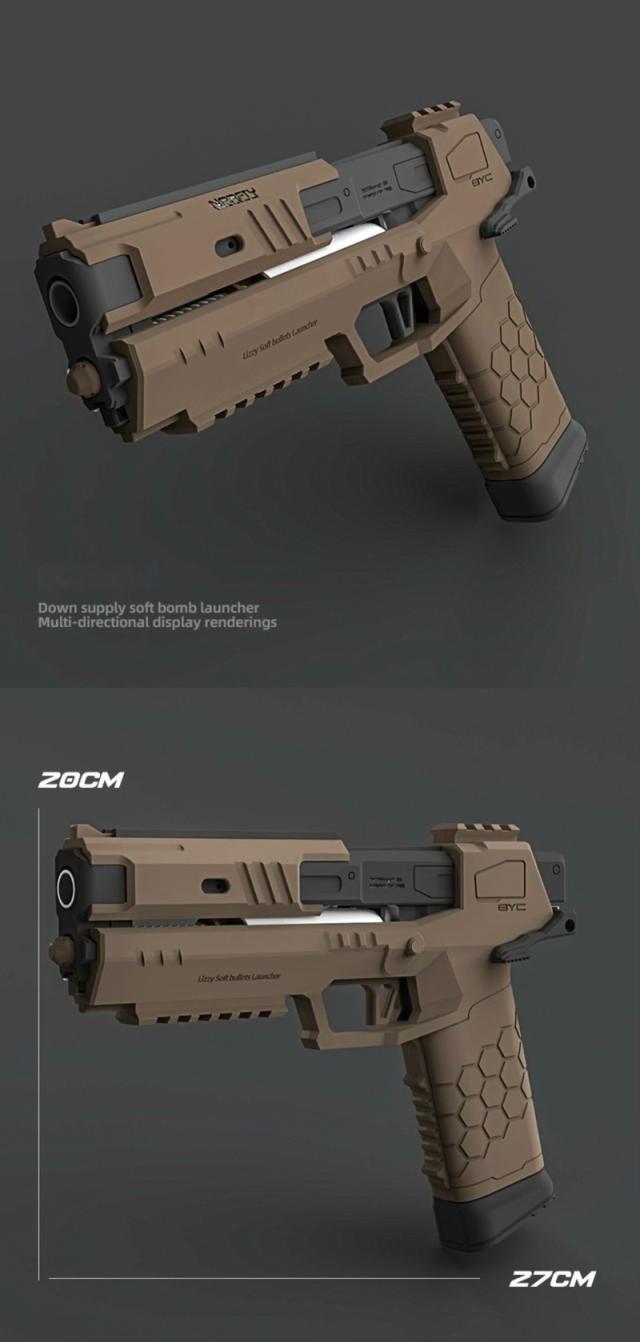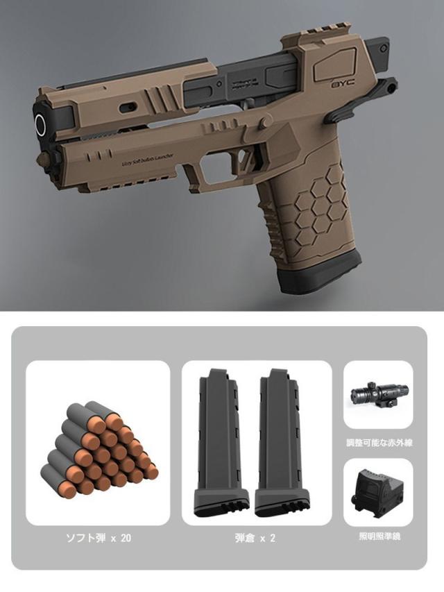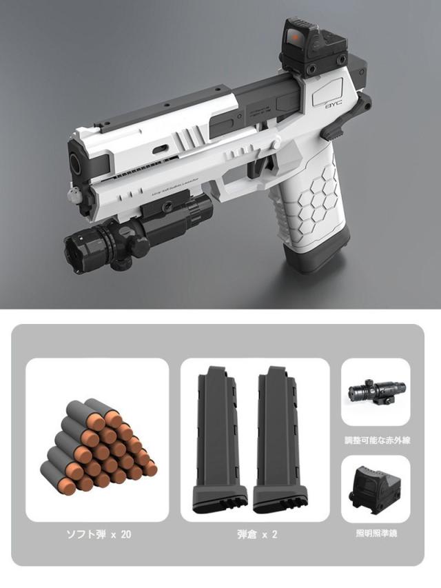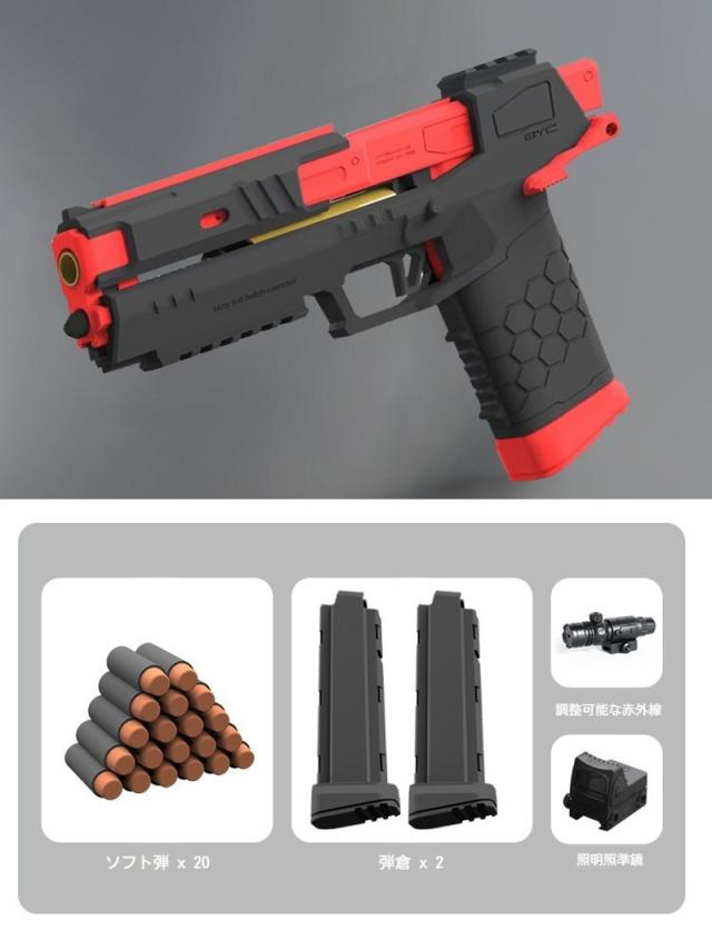 【子供向けに設計】安全を念頭に置いて子供向けに設計されたおもちゃの銃。20個の柔らかい弾丸を含みます。柔らかい弾丸は、無害な衝撃で8メートルの範囲で撃たれます。重さは約600gと軽くて手軽なハンドガンモデルです。
