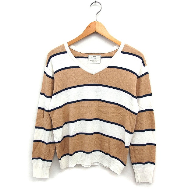 【中古】アングリッド UNGRID 配色ボーダー Vネック ニット セーター 長袖 ウール混 コットン 綿 F ベージュ ホワイト
