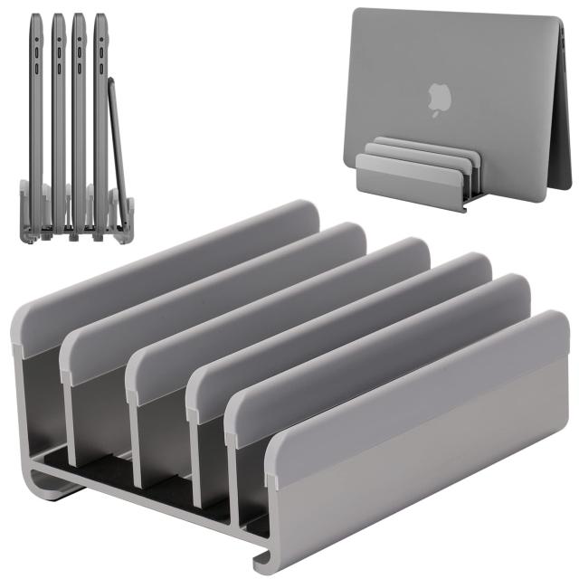縦置きで最大5台のデバイスを収納できるノートパソコンスタンド。幅は自由に調節可能で、素材のアルミニウムは、様々なブランドのノート