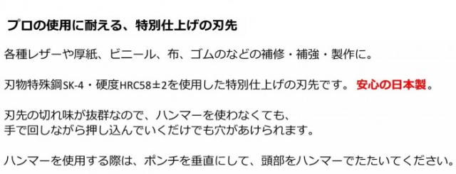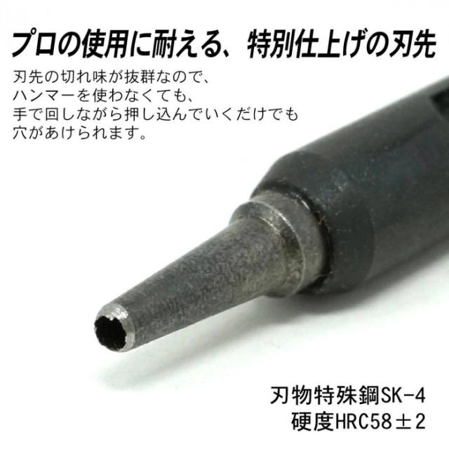 商品詳細:刃物特殊鋼SK-4・硬度HRC58±2を使用した特別仕上げの刃先です。各種レザーや厚紙、ビニール、布、ゴムのなどの補修・補強・製作におすすめです。刃先の切れ味が抜群なので、ハンマーを使わなくても、手で回しながら押し込んでいくだけでも穴があけられます。 生産国:日本 素材・材質:刃物特殊鋼SK-4 仕様:穴径:直径2.0mm