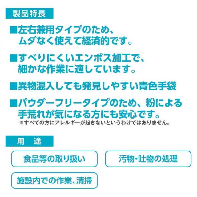 | TPE(熱可塑性エラストマー)素材の食品衛生法適合手袋。ポリエチレン製手袋に比べて伸縮性があるため、比較的フィットしやすく作業性に優れています。パウダーフリータイプのため、粉による手荒れが気になる方にも安心です。左右兼用でムダなくお使いいただけます。パウダーフリーのため、粉による手荒れが気になる方にも安心です。異物混入しても発見しやすい青色を採用しています。 ※すべての方に皮ふ刺激がおきないというわけではありません。 ※本品はディスポーザブル製品ですので、使用は一回限りとしてください。 ※品質保持のため、直射日光、高温、多湿での保管は避けてください。 |