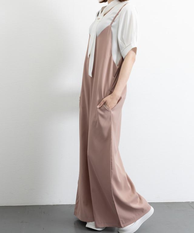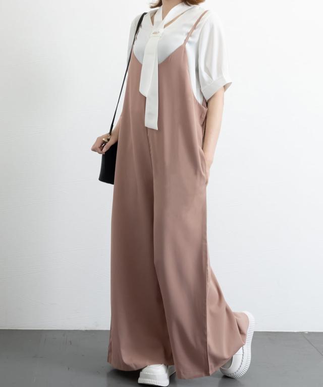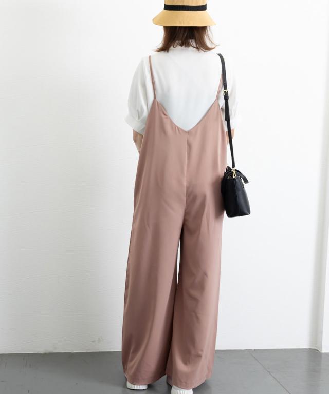 細めのストラップと前後Vラインがフェミニンで大人っぽい、キレイめに着られる大人サロペット