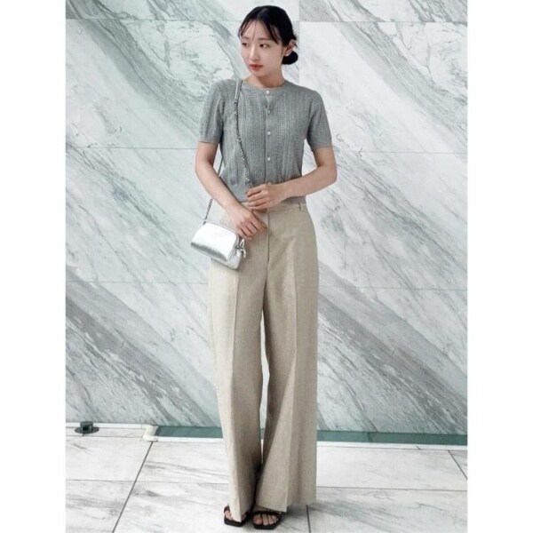 貝釦の光沢感を組み合わせ、カジュアルにもキレイめにも相性のよいアイテムに仕上げています。