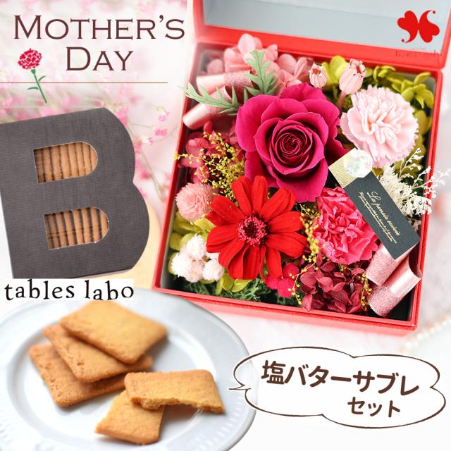 母の日 2026 プレゼント 花 ギフト プリザーブドフラワー hana*cube母の日ver と スイーツ 塩バターサブレ 焼き菓子 サブレ 母の日限定 クッキー セット お菓子 スイーツセット カーネーション プレゼント おしゃれ 母の日プレゼント 母の日ギフト 母 義母