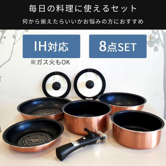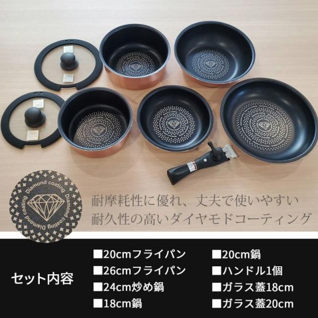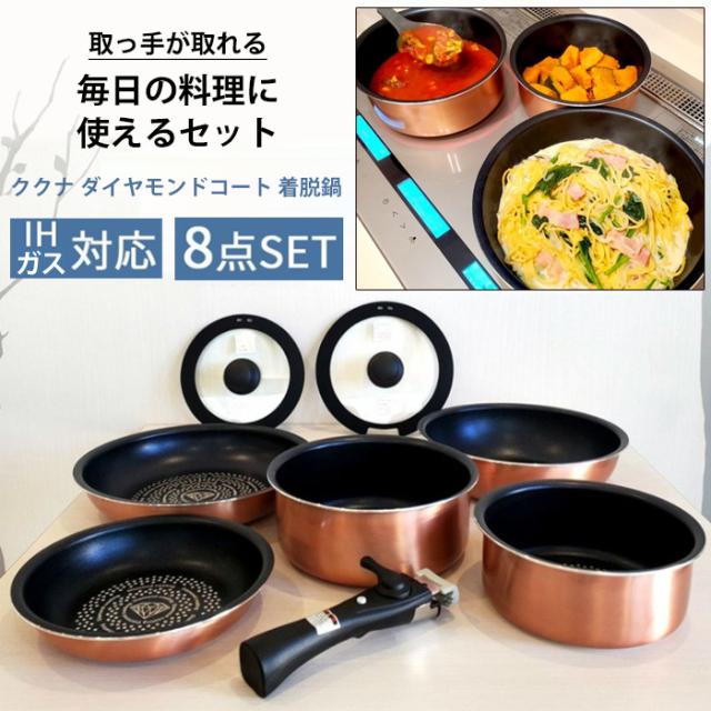 取っ手が取れる ククナ ダイヤモンドコート 着脱鍋 蓋付き 8点セット 着脱式 鍋 フライパンセット 直火 ガス ih IH対応 ガス火 ハンドル 取り外し可能 深型 フライパン 20cm 24cm 26cm 炒め鍋 片手なべ 18cm 洗いやすい PFOA フリー