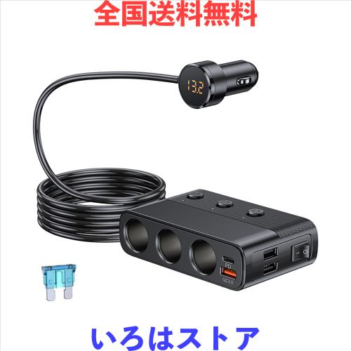 ◆商品名:Timloon シガーソケット3連 急速充電器USBポート4連 シガーソケット分路器付き LED電圧表示 PD/QC3.0充電器 独立スイッチ搭載 127W 12/24
