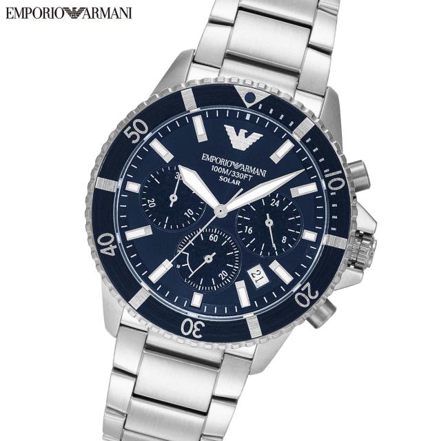 43.5mm径のケースにソーラークロノグラフムーブメントを搭載したEmporio ArmaniのWORLD EXPLORERウォッチ。ブルーのサンレイダイヤルに、サファイアクリスタルとスリークなステンレススチールブレスレットを組み合わせました。現代のライフスタイルに最適なソーラームーブメントを採用した、信頼性の高いデザインです。ウォッチが完全に充電されると、5か月間充電せずに使用可能です。ソーラームーブメントを搭載しているため、電池交換は不要です。Emporio Armaniのクラフツマンシップを見事に体現しているウォッチです。【エンポリオアルマーニ EMPORIO ARMANI 2025 新作】