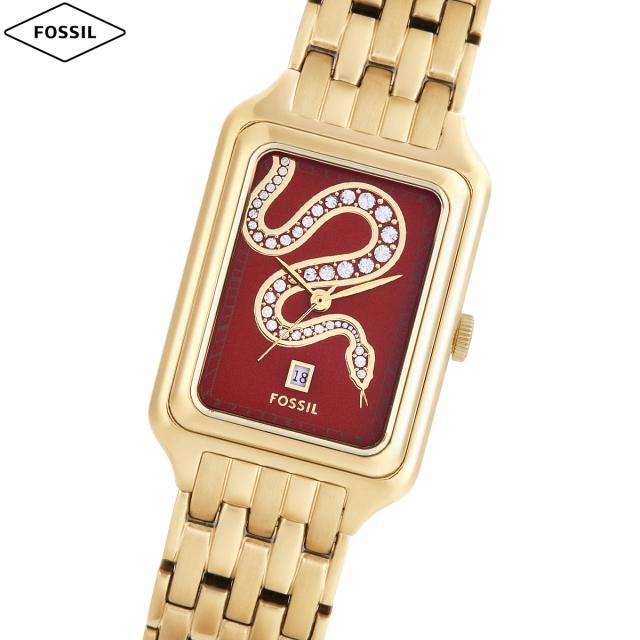 巳年を祝うLUNAR NEW YEARカプセルコレクション。巳年は知恵と変革を象徴しています。スリムで汎用性の高いレクタングル型のRAQUELウォッチは、ゴールドトーンのステンレススチール製7連リンクブレスレット、デイト表示付き三針ムーブメント、印象的なクリスタルのスネークをあしらったレッドのダイヤルが特徴です。【フォッシル FOSSIL】