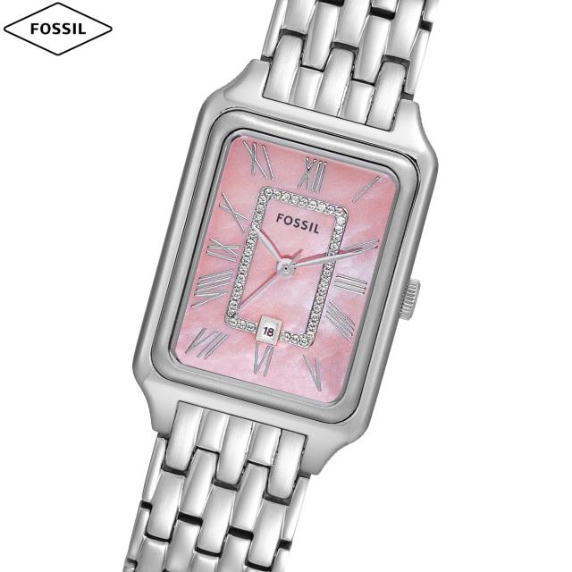 生まれ変わった正真正銘のアイコン、RAQUELウォッチ。スリムなレクタングル形ケースとステンレススチールブレスレットがタイムレスで洗練された魅力を演出します。光沢あるピンクのマザーオブパールダイヤルが輝く、コーディネート力の高いデザインです。デイト表示付き三針ムーブメントを搭載した実用的な機能性も備えています。ヴィンテージ風でありながら新鮮でモダンな魅力をたたえた、毎日使いたくなるクラシックなアイテムです。【フォッシル FOSSIL】
