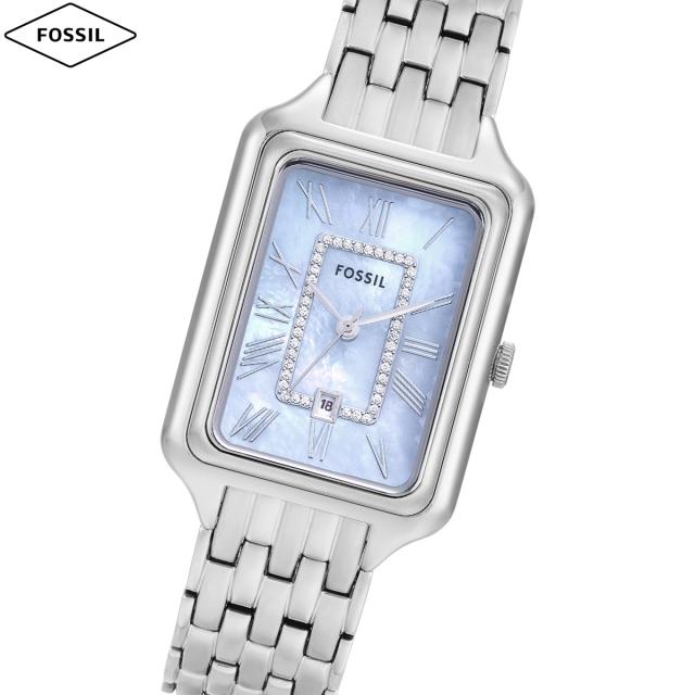 生まれ変わった正真正銘のアイコン、RAQUELウォッチ。スリムなレクタングル形ケースとステンレススチールブレスレットがタイムレスで洗練された魅力を演出します。光沢あるブルーマザーオブパールのダイヤルが輝く、コーディネート力の高いデザインです。デイト表示付き三針ムーブメントを搭載した実用的な機能性も備えています。ヴィンテージ風でありながら新鮮でモダンな魅力をたたえた、毎日使いたくなるクラシックなアイテムです。【フォッシル FOSSIL】