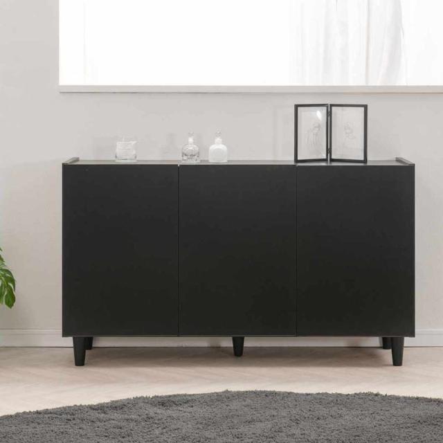 オールブラックで仕上げられた、存在感放つお洒落なキャビネットです。スッキリとしたシンプルなデザインとモノトーンな雰囲気で、お部屋をシックにカッコよく演出してくれます。軽やかな表情を追求した円すい形の木製脚が重厚感を和らげます。