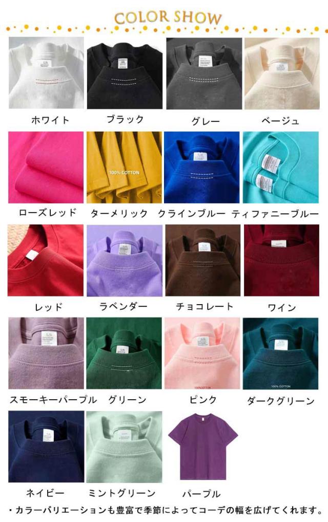 | 色 | ホワイト ブラック グレー ベージュ ローズレッド ターメリック クラインブルー ティファニーブルー レッド ラベンダー チョコレート ワイン スモーキーパープル グリーン ピンク ダークグリーン パープル ネイビー ミントグリーン |