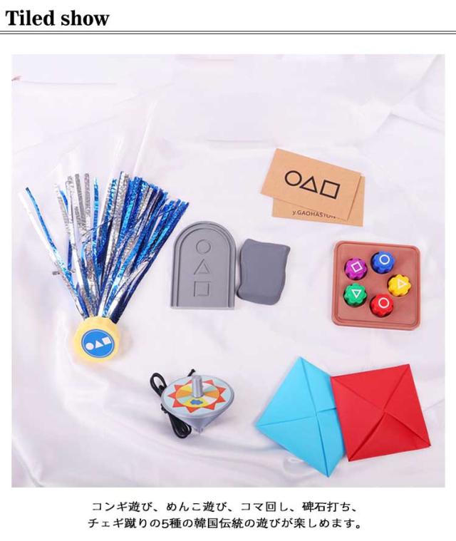 | 韓国の伝統的な遊びセット ゲーム5種セット コンギ遊び、めんこ遊び、コマ回し、碑石打ち、チェギ蹴りの5種の韓国伝統の遊びが楽しめます。 | |
